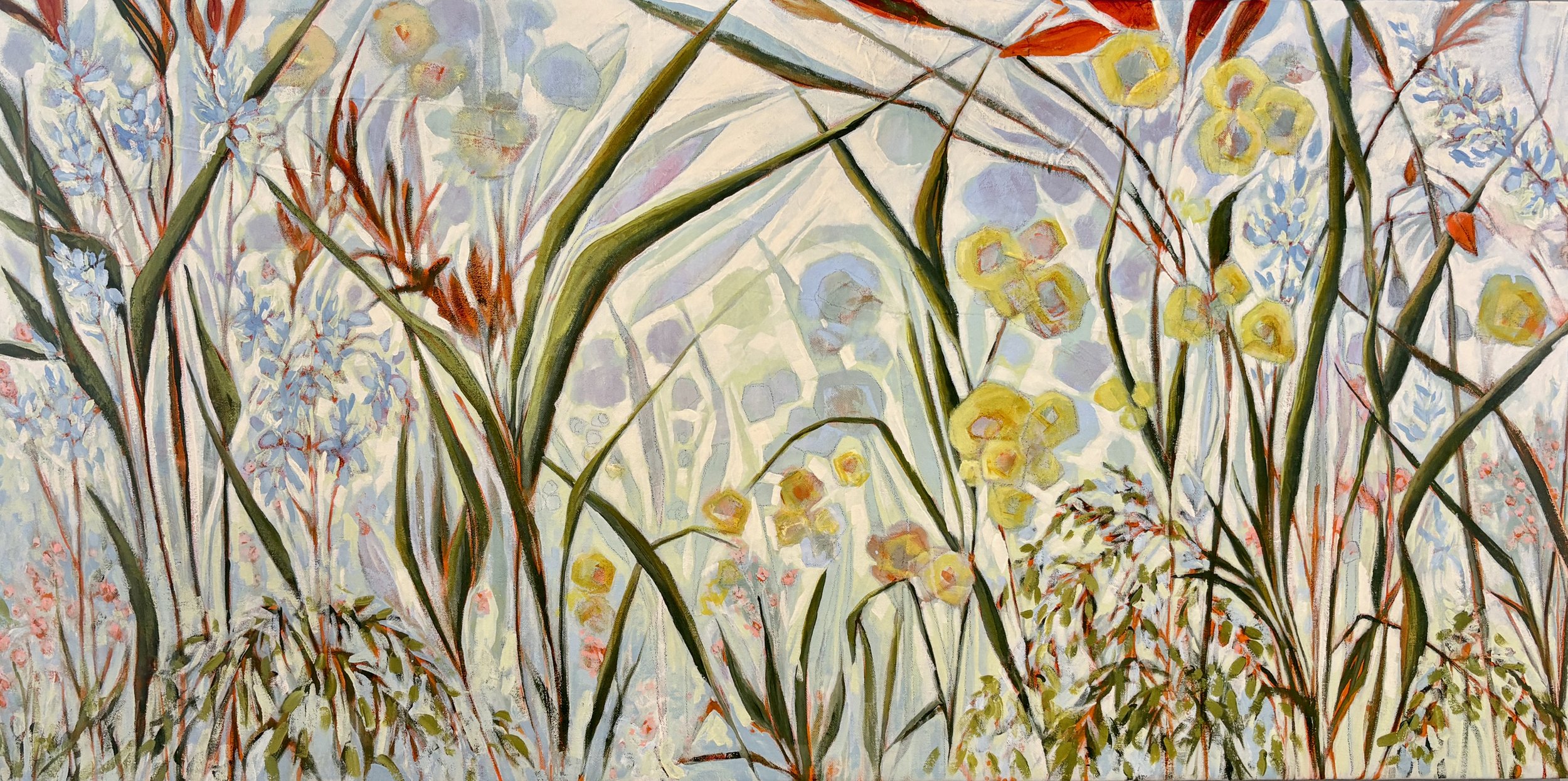 I create mixed-media paintings from an intimate perspective, inspired by vintage textiles and wall coverings, botanicals, and the beauty of handmade items marked by touch or time. Lush colour, expressive surfaces, and storied objects come together to transform the everyday into something timeless.